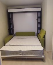 2) современная мебель и техника. Собственник оставляет: для прихожей (стойка для обуви, пуфик, зеркало, вешалка), для комнаты (кровать - трансформер с матрасом (двуспальный, куплен в 2026 г.), шкаф, полки); для кухни (встроенная кухня, плита, духовой шкаф, холодильник, микроволновая печь, стол раздвижной, стулья); для ванной (зеркало, стиральная машина), для с/у (шкаф); для балкона (шкаф).