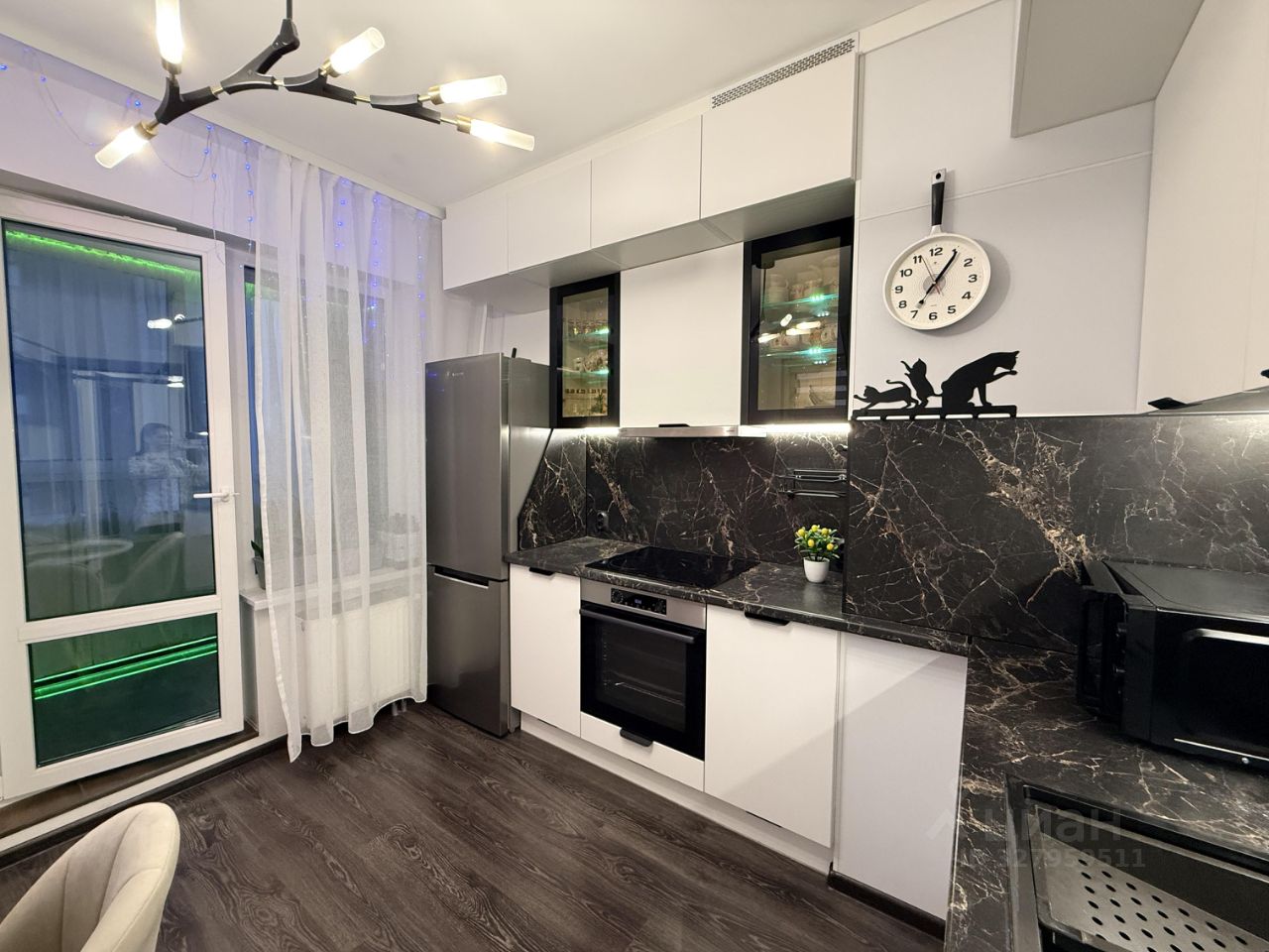 Просторная кухня оборудована современным и очень функциональным кухонным гарнитуром с техникой.