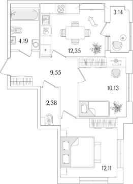 2-комн. квартира, 52,28 м²