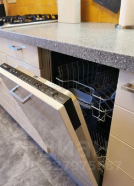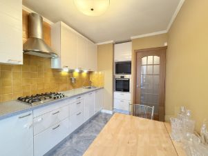 Светлая кухня 8,2 кв.м. со встроенным кухонным гарнитуром укомплектована полным набором бытовой техники: большой встроенный холодильник, газовая варочная поверхность, духовой шкаф, вытяжка, посудомоечная машина, телевизор.