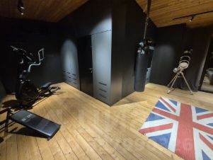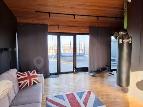 Второй этаж: большая комната свободной планировки со встроенными скрытыми шкафами, диваном, высоким потолком и остеклением в пол. Комната имеет три выхода на террасы.