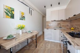 - Современная кухня, укомплектованная новой техникой на гарантии: холодильник, варочная панель, духовой шкаф, встраиваемые посудомоечная и стиральная машины.