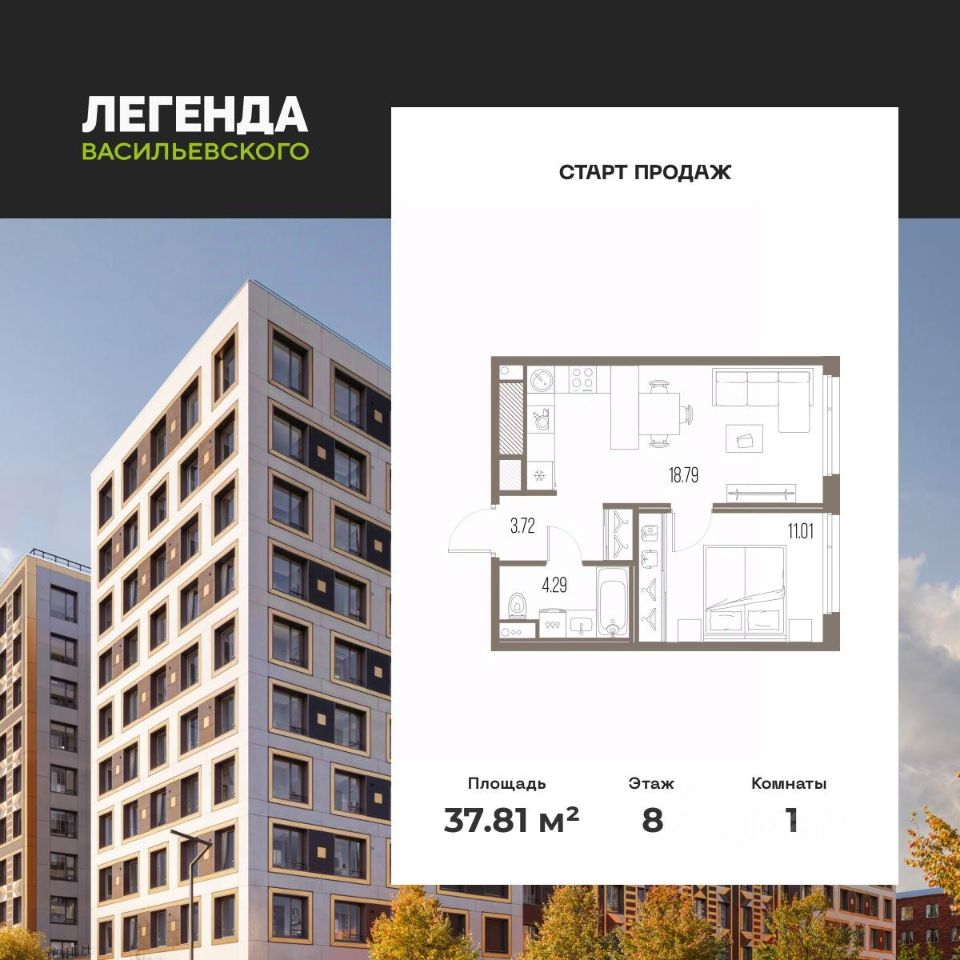 Продается 1-комн. квартира с предчистовой отделкой в ЖК "ЛЕГЕНДА Васильевского" на 8 этаже. Общая площадь: 37.81 кв.м. Высота потолков 2.7 м.