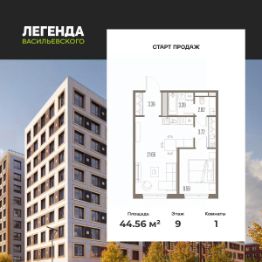 Просторная 1-комн. квартира с предчистовой отделкой в ЖК "ЛЕГЕНДА Васильевского" на 9 этаже. Общая площадь: 44.56 кв.м. Высота потолков 2.7 м.