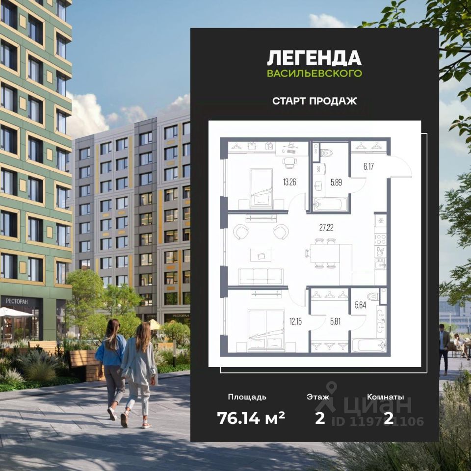 Двухкомнатная квартира от застройщика с предчистовой отделкой в ЖК "ЛЕГЕНДА Васильевского" на 2 этаже. Общая площадь: 76.14 кв.м., жилая: 25.41 кв.м., площадь просторной кухни-столовой: 27.22 кв.м. Комнаты изолированные, все окна выходят на одну сторону. В квартире два совмещенных санузла. Высота потолков 2.7 м.