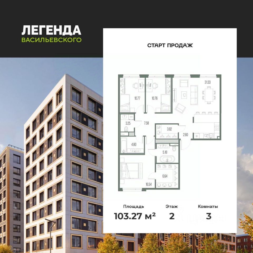 Просторная 3-комн. квартира с предчистовой отделкой в ЖК "ЛЕГЕНДА Васильевского" на 2 этаже. Общая площадь: 103.27 кв.м., жилая: 38.07 кв.м., площадь просторной кухни-столовой: 31.33 кв.м. Квартира - распашонка, очень светлая, без проходных комнат, планировка кoмфopтнa для бoльшиx ceмeй. В квартире один совмещенный и один раздельный санузел. Высота потолков 2.7 м.