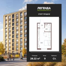 Просторная 1-комн. квартира-студия с предчистовой отделкой в ЖК "ЛЕГЕНДА Васильевского" на 9 этаже. Общая площадь: 28.22 кв.м. Высота потолков 2.72 м.