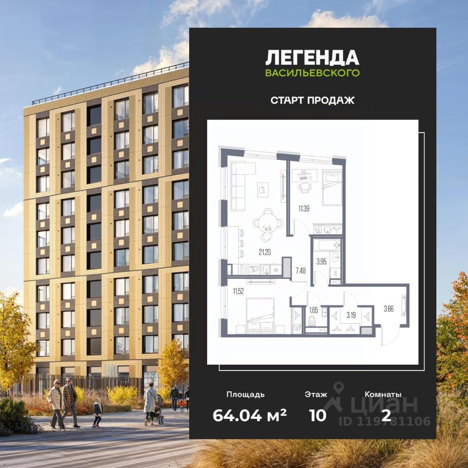 2-комн. квартира с предчистовой отделкой в ЖК "ЛЕГЕНДА Васильевского" на 10 этаже. Общая площадь: 64.04 кв.м. Высота потолков 2.72 м.