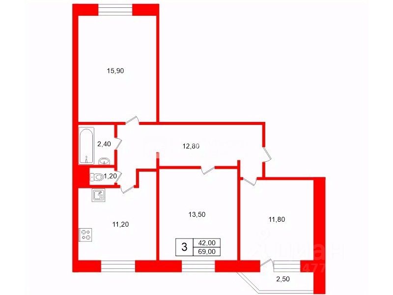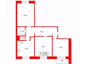 Общая площадь: 69 м2. 3 комнаты - 16, 14 и 12 м, кухня - 11 м.