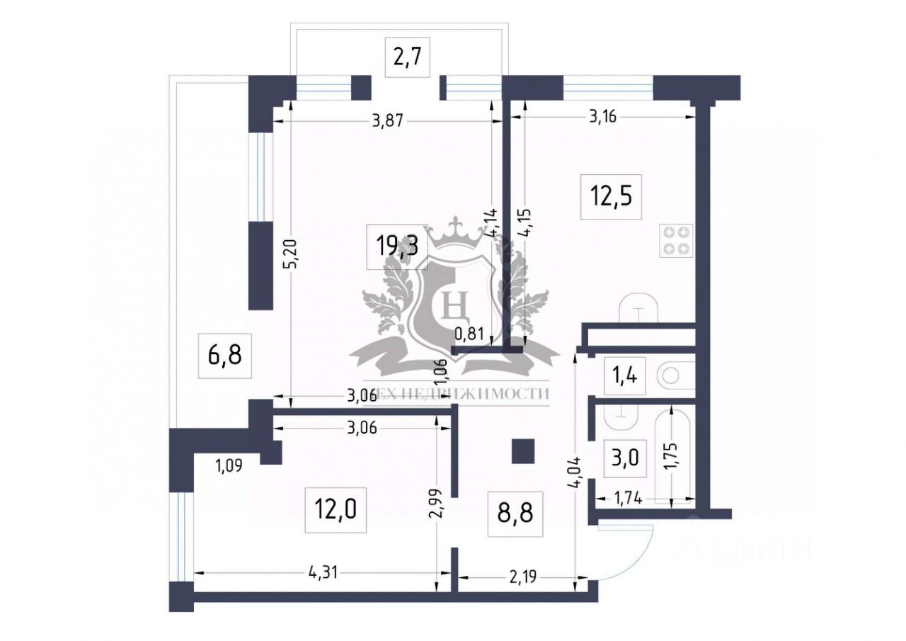 Общая площадь 57 кв.м. (без учета двух балконов)