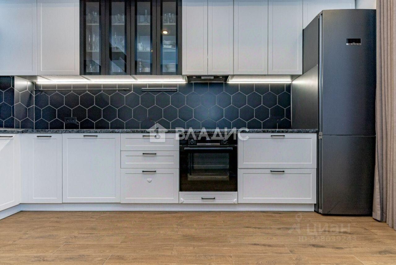Кухня со всей строенной техникой: варочная поверхность, духовой шкаф, СВЧ, вытяжка, холодильник, посудомоечная машина, измельчитель отходов