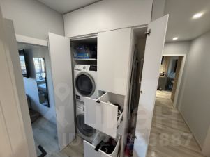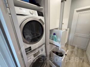 Отдельно организован прачечный блок: стиральная и сушильная машины, зона для глажки — всё аккуратно встроено и скрыто, не перегружает интерьер и делает быт максимально удобным.
