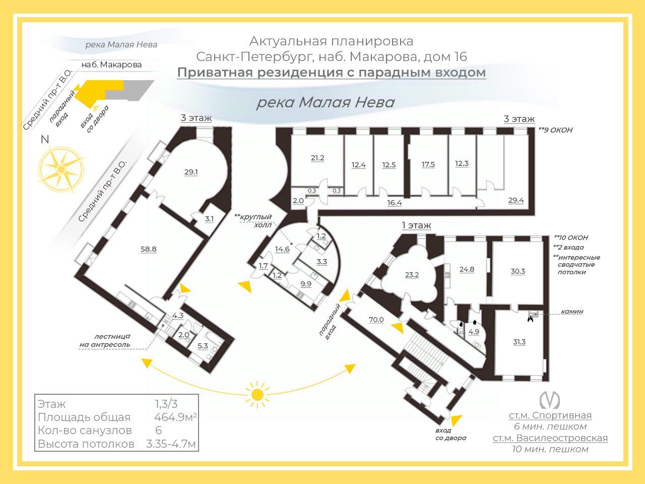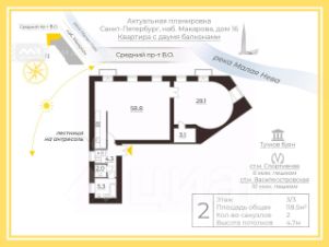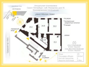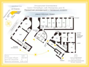 - Два входа. Первый парадный с набережной Макарова с личной исторической пологой лестницей ( 70м2). Второй "черный" со двора.