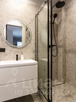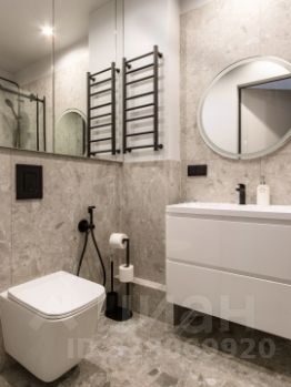 Санузел совмещенный - это душ с тропической лейкой, широкая раковина с тумбой и зеркалом с подсветкой, подвесной унитаз со сливом "торнадо" и гигиеническим душем. Есть встроенные шкафчики с зеркальными дверками, установлены фильтры на воду, теплый пол.