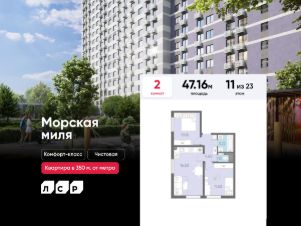 Цена действует при 100% оплате и на определенные ипотечные программы. Подробности — в отделе продаж по телефону. Продается 2-комнатная квартира в ЖК "Морская миля" на 11 этаже. Общая площадь составляет 47.16 кв. м. Квартира с чистовой отделкой. Жилой комплекс "Морская миля" располагается по адресу Санкт-Петербург, Красносельский. Морская миля - жилой комплекс в Красносельском районе Санкт-Петербурга. Расположение комплекса - его главное преимущество: близость к таким историческим памятникам и местам, как Петергоф, Павловский дворец и Царское село позволяет в любой момент насладиться красотами культурной столицы России. Расположение: - всего 350 м до новой станции метро "Юго-Западная"; - 20 минут до Петергофа на автомобиле; - 20 минут до аэропорта "Пулково" на автомобиле; - 30 минут до Царского села на автомобиле. Между корпусами расположены спортивные и детские площадки, пешеходный бульвар. В квартире выполнена полная отделка "Comfort Wood" из качественных материалов: прочный ламинат цвета благородного дуба, фактурные белые обои, керамическая плитка в ванной. Вход в парадные расположен на уровне земли и создает доступную среду для пожилых людей, людей с ограниченными возможностями и мам с колясками. На этажах и в подвале есть кладовые, которые позволят освободить пространство квартиры от лишних вещей. Первые этажи отведены под магазины и колясочные. На территории комплекса находятся наземные паркинги, гостевые парковки, детский сад, школа. В пешей доступности расположены магазины, кафе, аптеки и прочие удобства, необходимые для спокойной и комфортной жизни. Во дворах устроены пешеходные зоны, дворы озеленены и благоустроены: имеются тенистые аллеи, уютные зоны для отдыха детей и взрослых, а также стильные плей-хабы. Преимущества: - Станция метро в пешей доступности - Пешеходный бульвар - Близость к памятникам культуры и архитектуры - Школа и детский сад во дворе - Доступная среда Успейте приобрести квартиру на выгодных условиях! Чтобы узнать подробности, обращайтесь за консультацией по телефону.