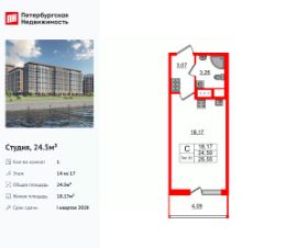 Удобная, классическая, функциональная европланировка, вместительная прихожая 3.07 м². Общая площадь студии - 24.5 м², жилая 18.17 м², высота потолка 2.77 м.