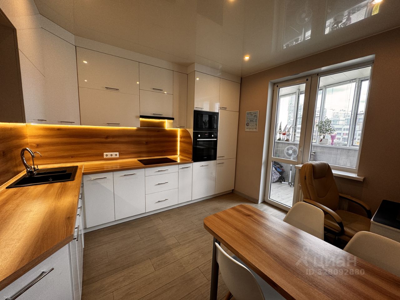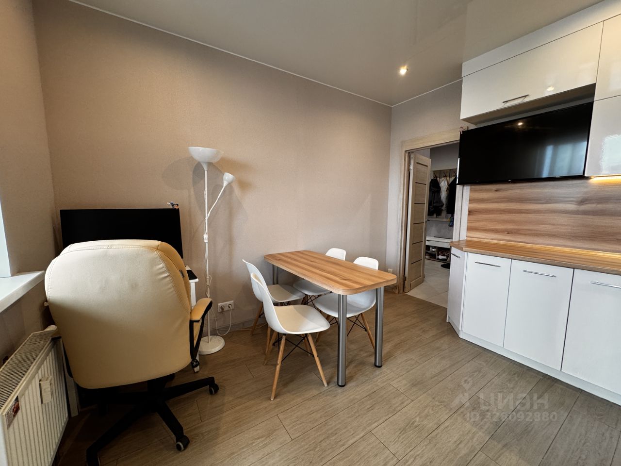 Квартира имеет очень удачную планировку: Общая площадь - 44.6 кв.м., кухня- гостиная - 17.3 кв.м. с выходом на лоджию - 4.7 кв.м, комната - 17.2 м, совмещенный сан.узел - 4 кв.м., коридор - 8.4 кв.м., в коридоре расположена гардеробная - 3 кв.м, на кухне и в коридоре имеются теплые полы. В стоимость квартиры входит встроенная кухонная мебель. Высота потолка - 2.77 метра.