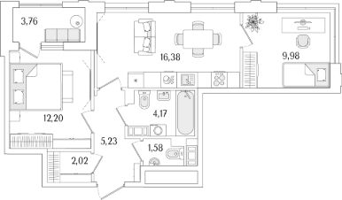 2-комн. квартира, 53,44 м²