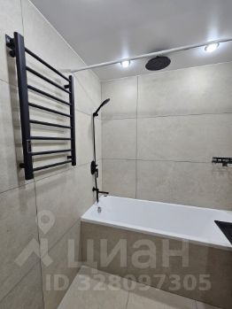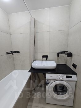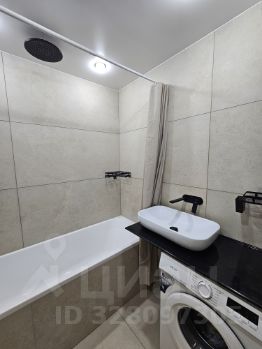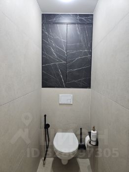Ванная комната и туалет выполнены в светлых тонах керамогранита, оборудованы стильной черной сантехникой. В ванне установлена новая стиральная машина. В туалетной комнате установлены магистральный фильтры очистки воды.