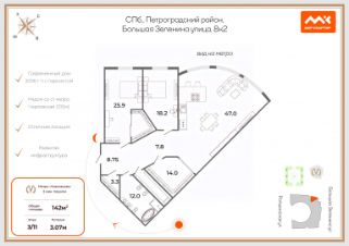Квартира общей площадью 142 кв.м., расположена на высоком третьем этаже (по факту это уровень четвертого этажа)! Две минуты пешком до метро Чкаловская! Окна выходят на ст. метро "Чкаловская", ул Большая Зеленина и на Ропшинскую улицу.