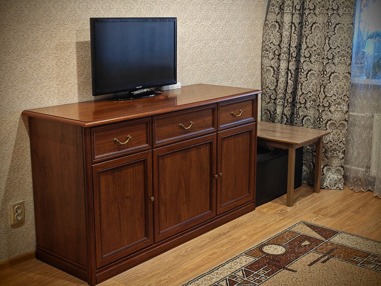 Под плиткой электрический ТЕПЛЫЙ ПОЛ - в ванной, коридоре и кухне, в комнате ламинат. На стенах обои, потолок натяжной.