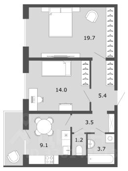 Двухкомнатная квартира 56,6 м², одна из комнат 19,7 м² (подходит под зал или спальню) и вторая комната 14 м² (подходит под детскую или спальню). Кухня 9,1 м² с выходом на застекленный утепленный балкон. Раздельный санузел.