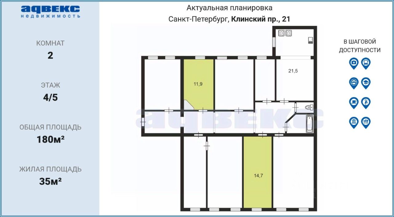 Предлагаются к продаже две комнаты в шестикомнатной квартире, расположенной по адресу: Санкт-Петербург, Адмиралтейский район, Клинский проспект, дом 21. Объект находится на четвёртом этаже кирпичного многоквартирного дома. Общая площадь квартиры составляет 180 квадратных метров, из которых кухня занимает 20 квадратных метров.