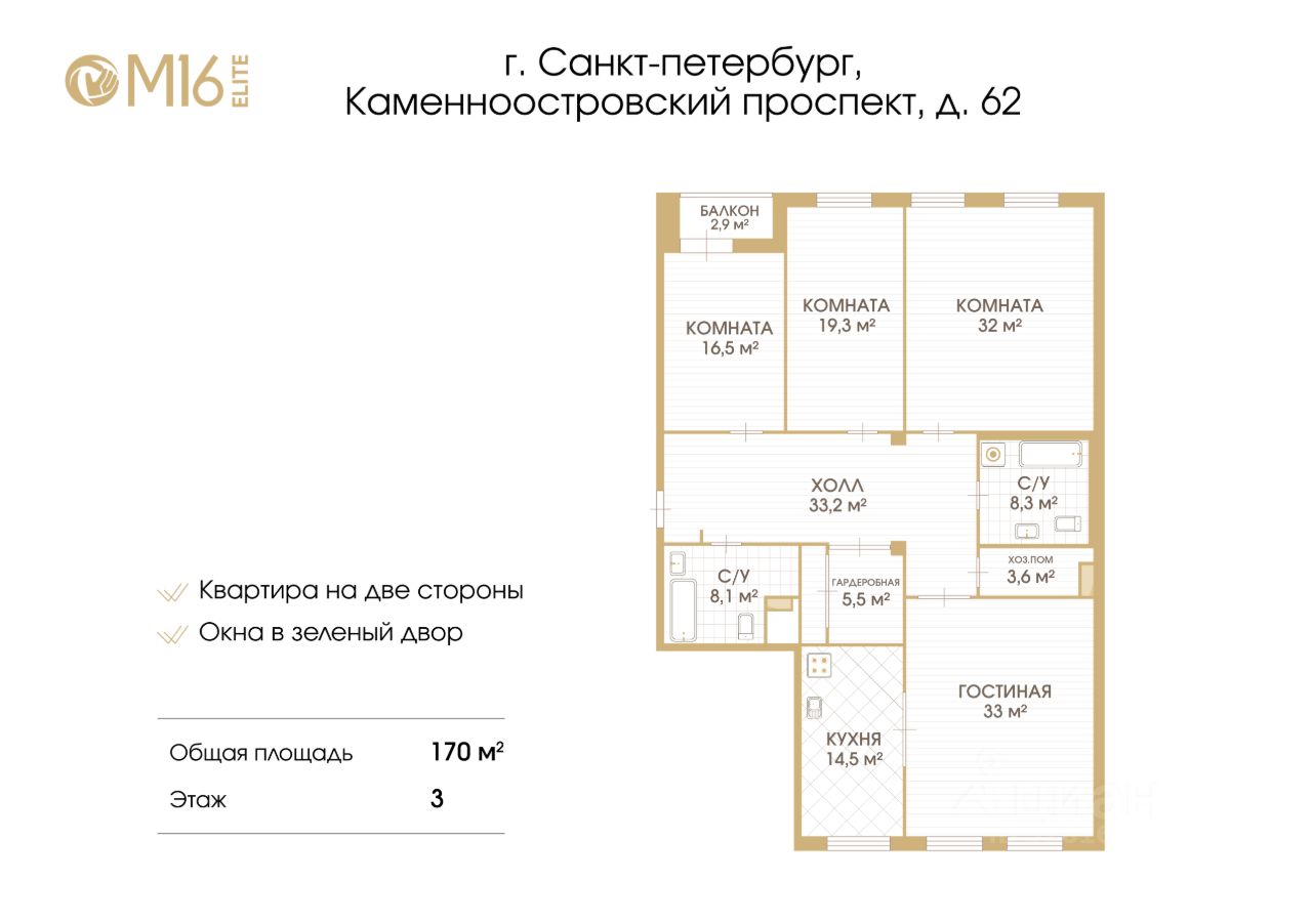 • Идеальная планировка для жизни: три изолированные комнаты с видом на тихий двор, просторная кухня-гостиная с окнами на Каменноостровский проспект и особняк Игеля, вместительная гардеробная, два санузла. Двухсторонняя квартира с потолками 3,2 м и большим холлом — всё для максимального комфорта.
