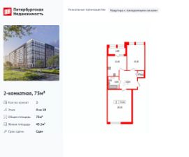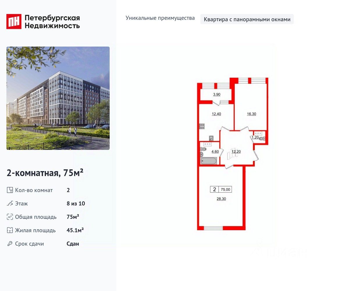 Уникальная планировка, кухня 12.3 м², просторная прихожая 11.8 м². Общая площадь квартиры - 75 м², жилая 45.1 м², высота потолка 3 м.
