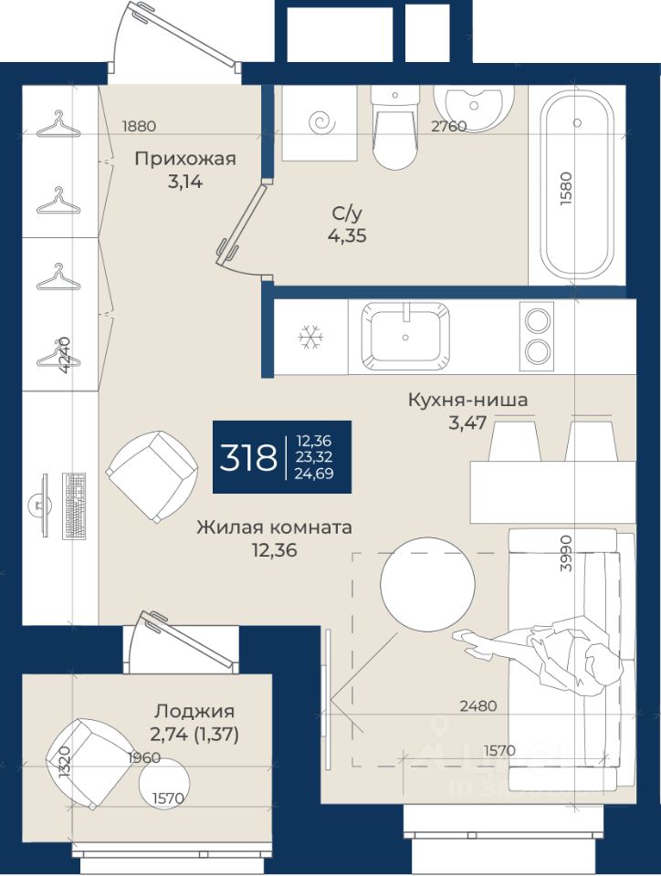 Продаётся студия в строящемся доме (Корпус Б), срок сдачи: IV-кв. 2026, общей площадью 24.69 кв.м., на 7 этаже. Новый жилой комплекс "Новатория" от застройщика "ГК NovaStroy" расположен по адресу: Россия, Ленинградская область, Ломоносовский район, Аннинское городское поселение, городской посёлок Новоселье, Центральная