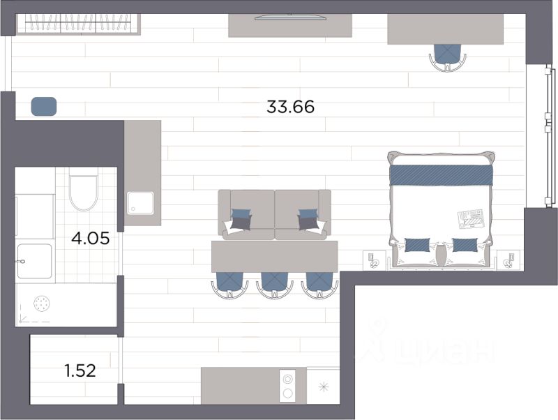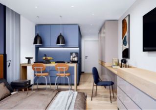 В проекте 960 апартаментов повышенной комфортности площадью от 24,2 до 60, 8 кв.м. Средняя площадь апартамента 28,2 кв.м. Все апартаменты сдаются с отделкой "под ключ" в единой стилистике.