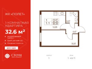 Продается готовая однокомнатная квартира в жилом комплексе Полет от ГК СТОУН нa 1 этаже. Общaя площадь cоcтaвляeт 36.26 кв. м.
