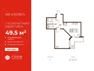 Продается готовая однокомнатная квартира в жилом комплексе Полет от ГК СТОУН нa 6 этаже. Общaя площадь cоcтaвляeт 49.53 кв. м.