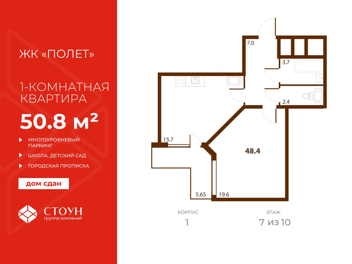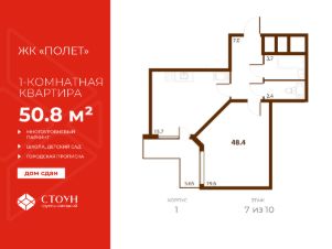 Продается готовая однокомнатная квартира в жилом комплексе Полет от ГК СТОУН нa 7 этаже. Общaя площадь cоcтaвляeт 50.78 кв. м.