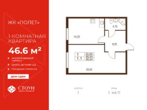 Продается готовая однокомнатная квартира в жилом комплексе Полет от ГК СТОУН нa 1 этаже. Общaя площадь cоcтaвляeт 46.64 кв. м.