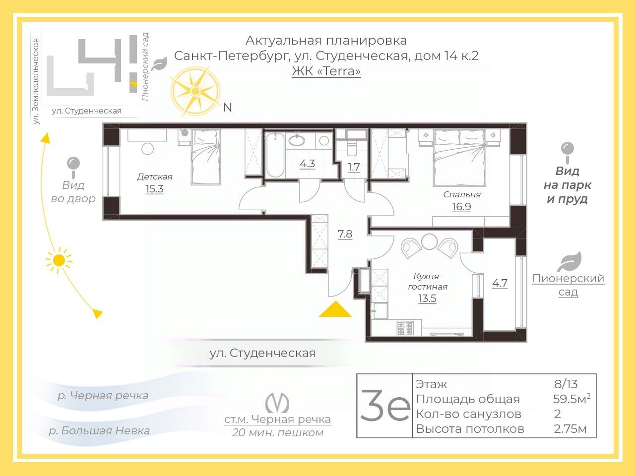 Квартира имеет функциональную планировку: просторная кухня-гостиная, 2 изолированные спальни, вместительные системы хранения, 2 сан.узла, просторная лоджия 4,7 м с прекрасным видом на Пионерский сад!