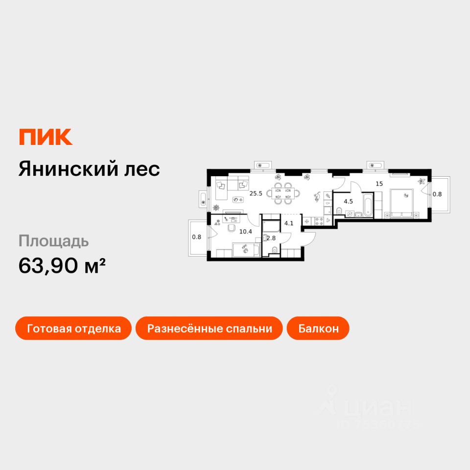 Продаётся 2-комн. квартира площадью 63,9 кв.м на 7 этаже 15 этажного дома (Корпус 2, Секция 2) проекта ПИК Янинский лес. Светлый просторный подъезд на уровне земли, функциональная планировка, большие окна, c отделкой.