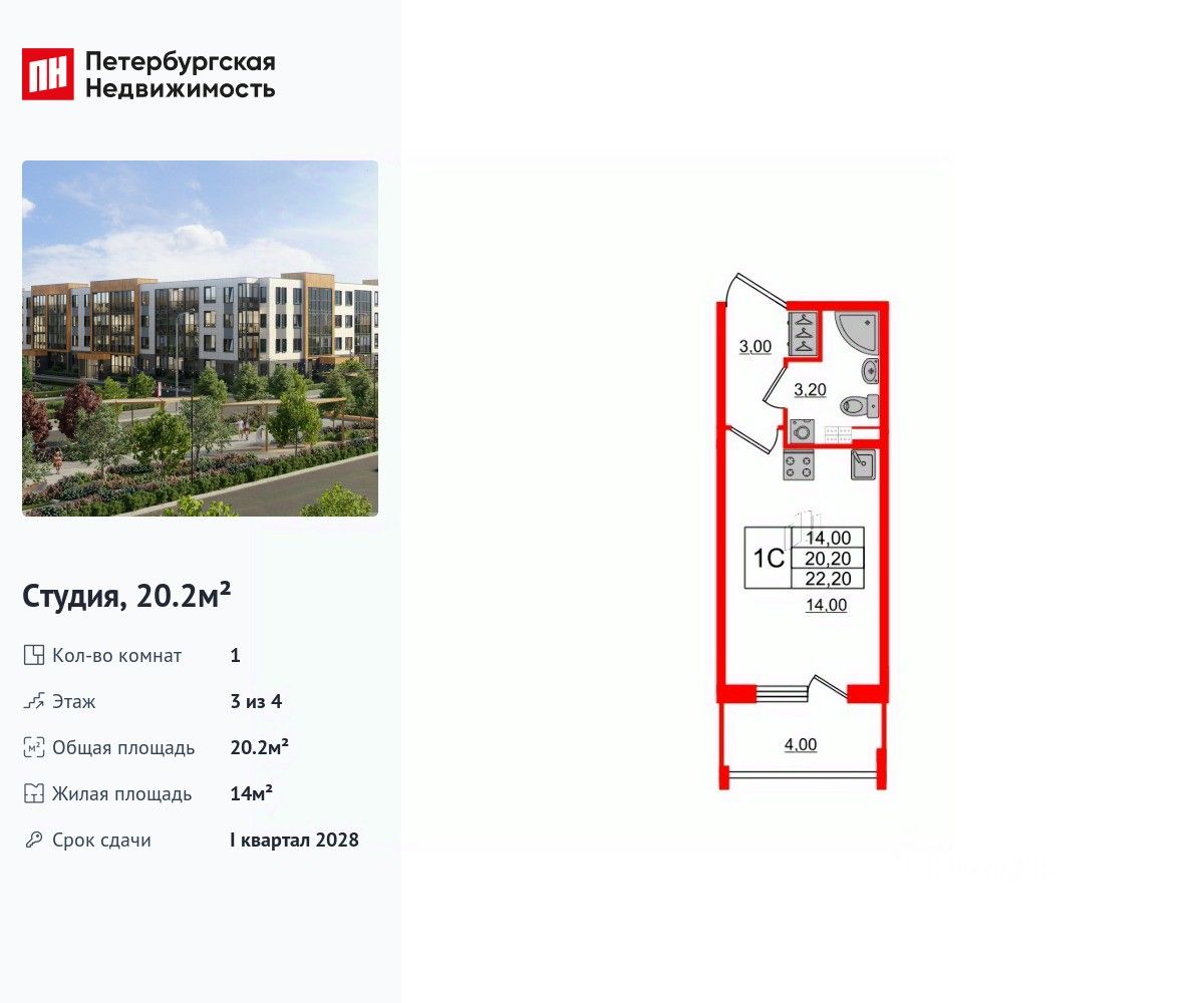 Удобная, классическая, функциональная европланировка, вместительная прихожая 3 м². Общая площадь студии - 20.2 м², жилая 14 м², высота потолка 2.78 м.