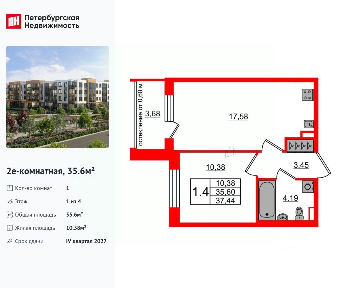 Удобная, классическая, функциональная европланировка, большая кухня-гостиная 17.58 м², вместительная прихожая 3.45 м². Общая площадь квартиры - 35.6 м², жилая 10.38 м², высота потолка 2.77 м.
