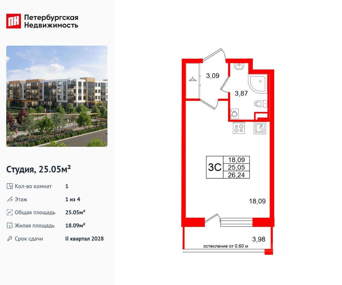Удобная, классическая, функциональная европланировка, вместительная прихожая 3.09 м². Общая площадь студии - 25.05 м², жилая 18.09 м², высота потолка 2.77 м.