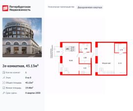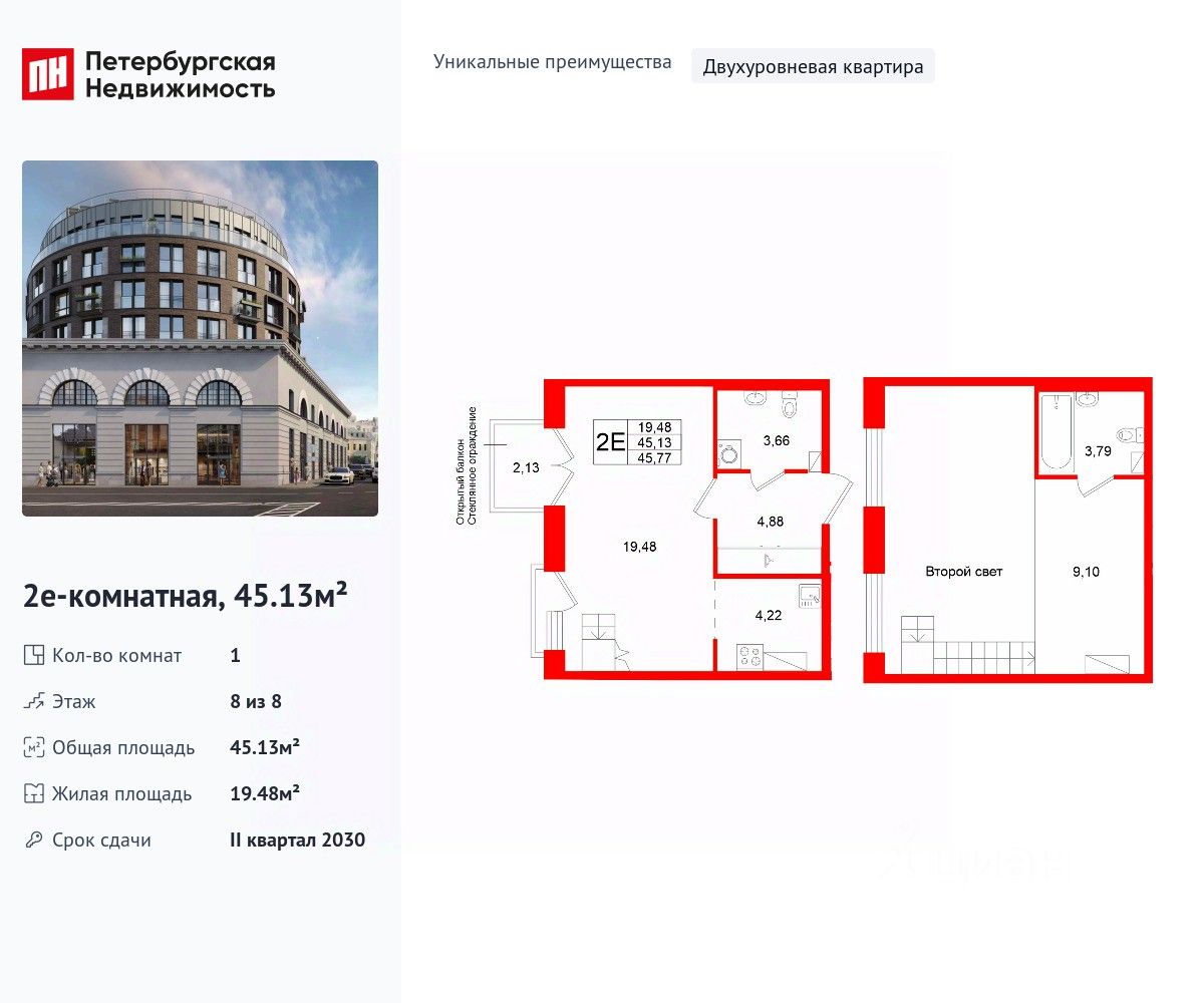 Уникальная, функциональная европланировка, просторная прихожая 4.88 м². Общая площадь квартиры - 45.13 м², жилая 19.48 м².