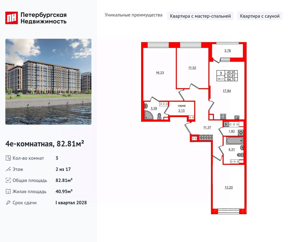 Уникальная, функциональная европланировка, большая кухня-гостиная 17.84 м², просторная прихожая 11.37 м². Общая площадь квартиры - 82.81 м², жилая 40.95 м², высота потолка 2.77 м.
