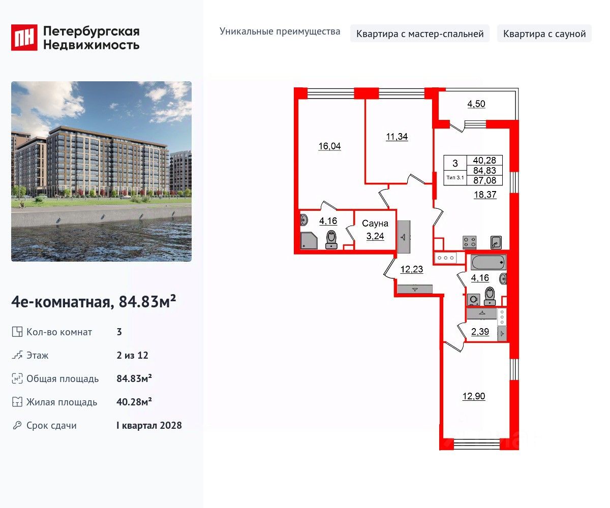 Уникальная, функциональная европланировка, большая кухня-гостиная 18.37 м², просторная прихожая 12.23 м². Общая площадь квартиры - 84.83 м², жилая 40.28 м², высота потолка 2.77 м.