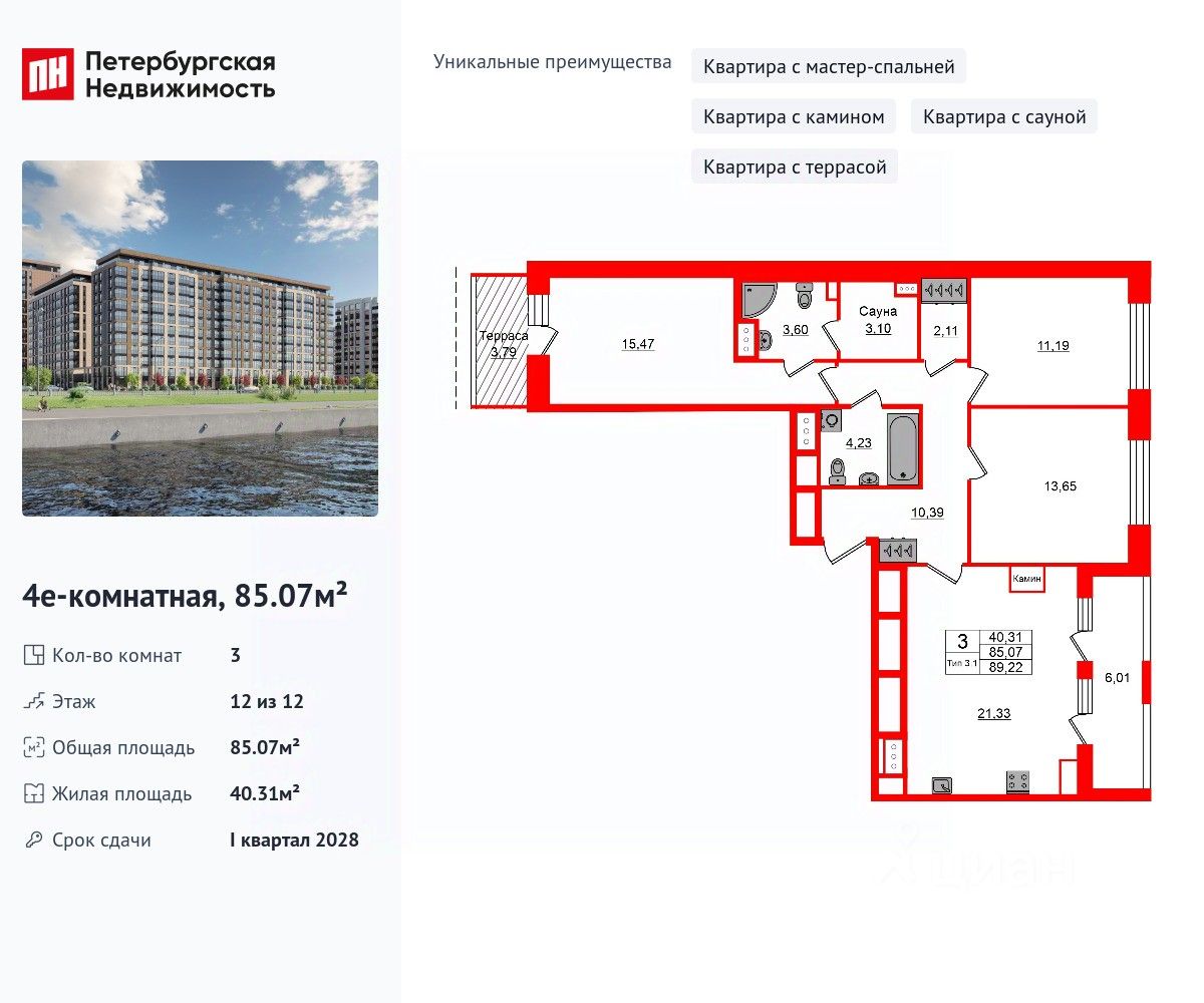 Уникальная, функциональная европланировка, большая кухня-гостиная 21.33 м², вместительная прихожая 10.39 м². Общая площадь квартиры - 85.07 м², жилая 40.31 м², высота потолка 3.04 м.