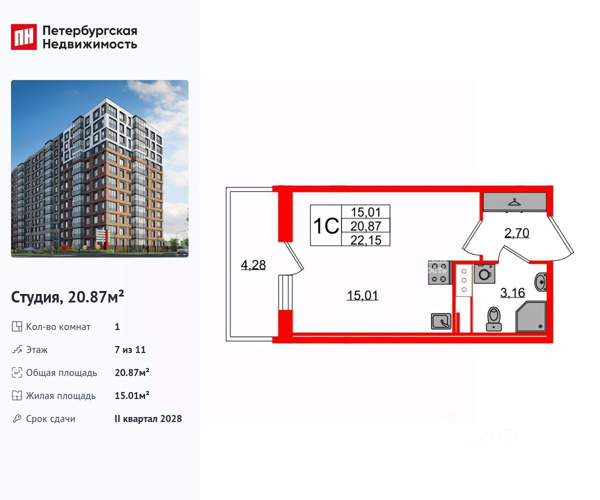 Удобная, классическая, функциональная европланировка, вместительная прихожая 2.7 м². Общая площадь студии - 20.87 м², жилая 15.01 м², высота потолка 2.77 м.