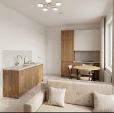 Квартира прямоугольной формы, с двумя окнами (очень светлая)я Это дает простор для воображения в плане различных вариантов зонирования пространства. На данный момент в квартире нет кухни, поэтому для понимания в карусель фото добавила вариант практичного интерьерного решения, сочетающий в себе удобство и визуальную легкость.