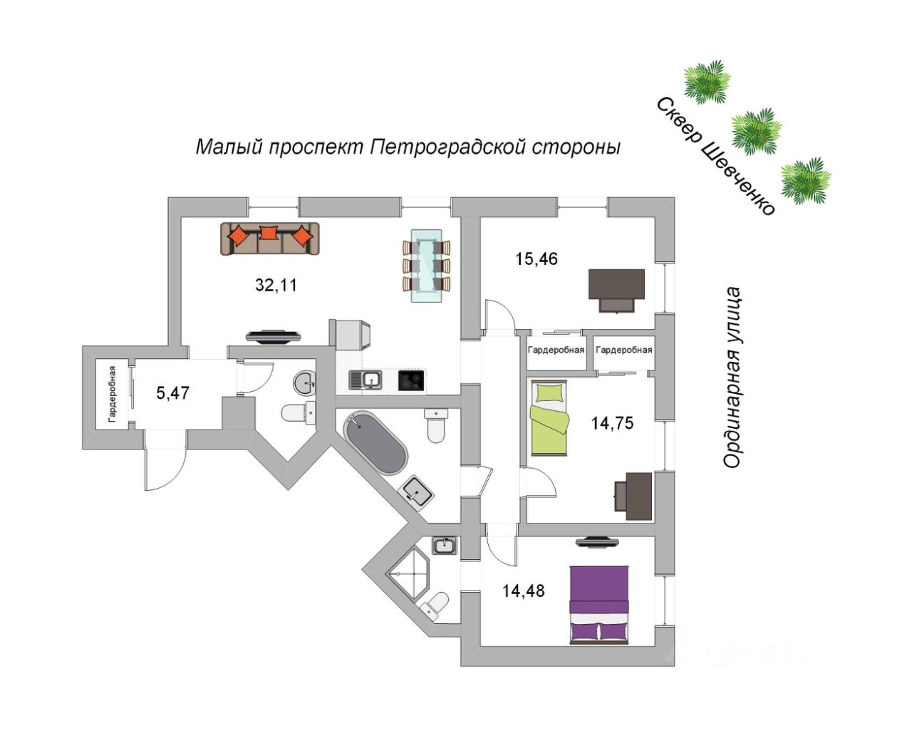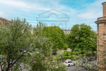 Квартира угловой планировки: окна выходят на зеленый сквер Шевченко, на Ординарную улицу и на Малый проспект Петроградской стороны.
