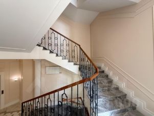 Интерьер лобби выполнен в неоклассическом стиле. Полы покрыты керамогранитом, стены облицованы штукатуркой и зеркалами. Красивая парадная лестница с деревянными перилами.