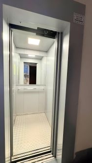 * Выход из парадной в зеленый двор с детской площадкой ;