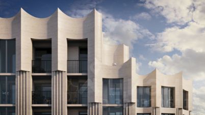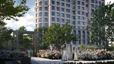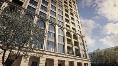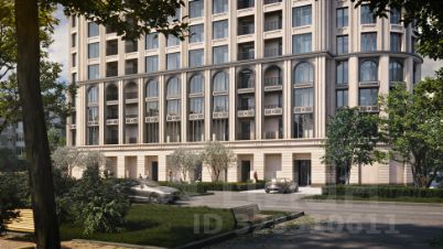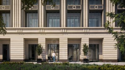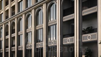 Фасад дома разработан с отсылкой к стилям сталинского ампира и ар-деко.